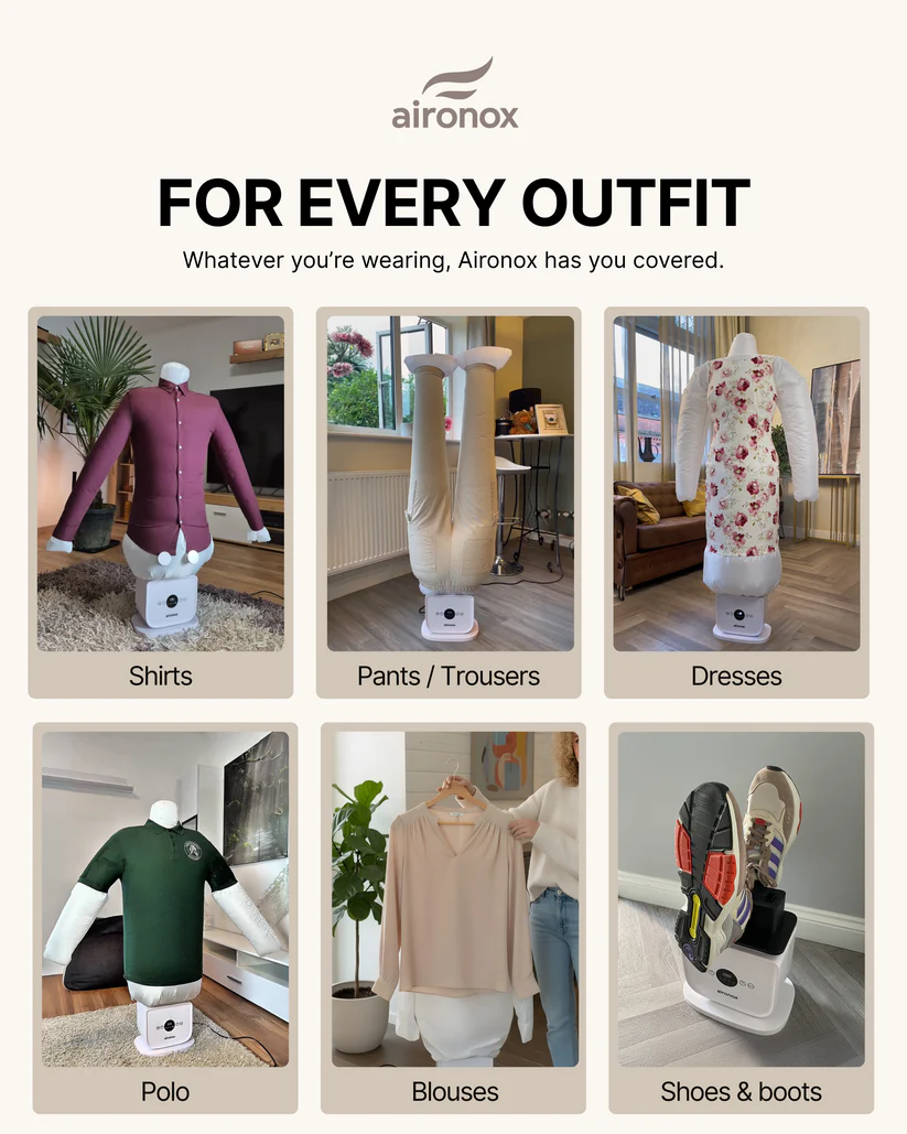 The Aironox™ Automatic Ironing Machine transforms everyday clothing care into a faster, simpler routine. Using controlled hot air and dedicated garment attachments, Aironox smooths clothes with minimal effort. Just put on your garment, turn it on, and let the process run automatically. Designed for regular home use, it helps reduce wrinkles in shirts, trousers, dresses, and similar items while remaining gentle on fabrics. With simple controls and durable construction, Aironox™ helps you save time, reduce effort, and step into neatly finished clothes every day.